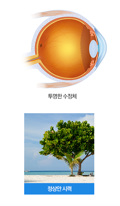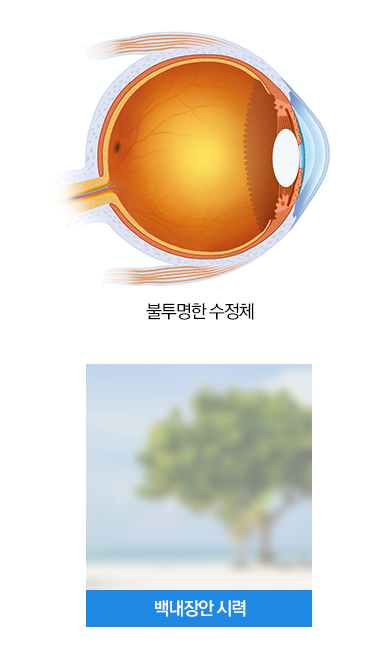 눈으로 들어온 빛은 수정체를 통과하고 굴절되어 망막에 상을 맺게 되는데, 백내장은 이러한 수정체가 혼탁해져 빛을 제대로 통과시키지 못하게 되면서 안개가 낀 것처럼 시야가 뿌옇게 보이게 되는 질환입니다.